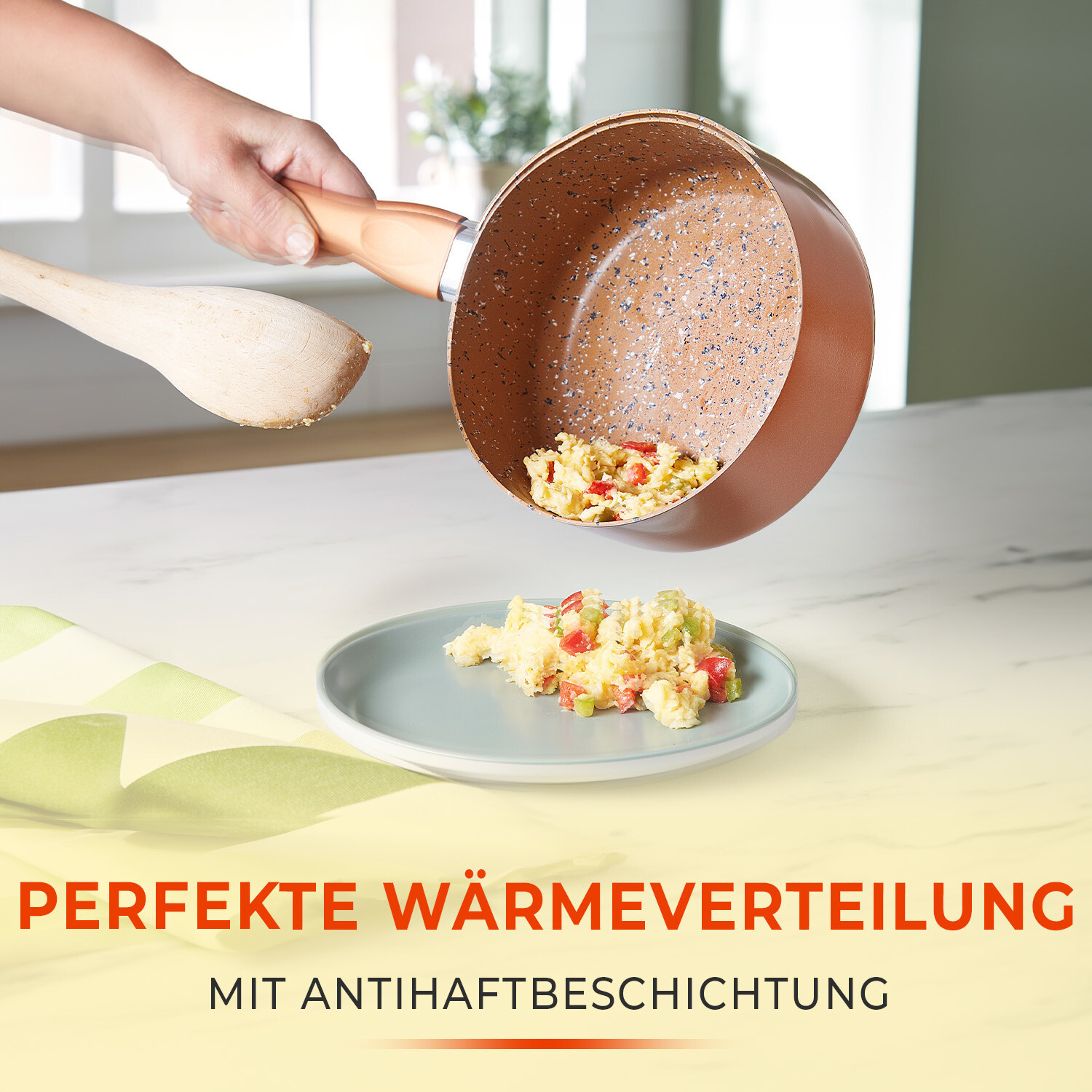 Tvrdé ako žula, odolné proti poškriabaniu a príjemne ľahké, s extra silným nepriľnavým povrchom. Vďaka optimálnemu rozloženiu tepla ušetríte nielen kalórie, ale aj energiu a náklady na elektrinu. Ideálne na zdravé varenie s nízkym obsahom tuku. 3-dielna súprava hrncov: Ø 18 cm s pokrievkou, Ø 16 cm s pokrievkou, Ø 14 cm hrniec na mlieko bez pokrievky.