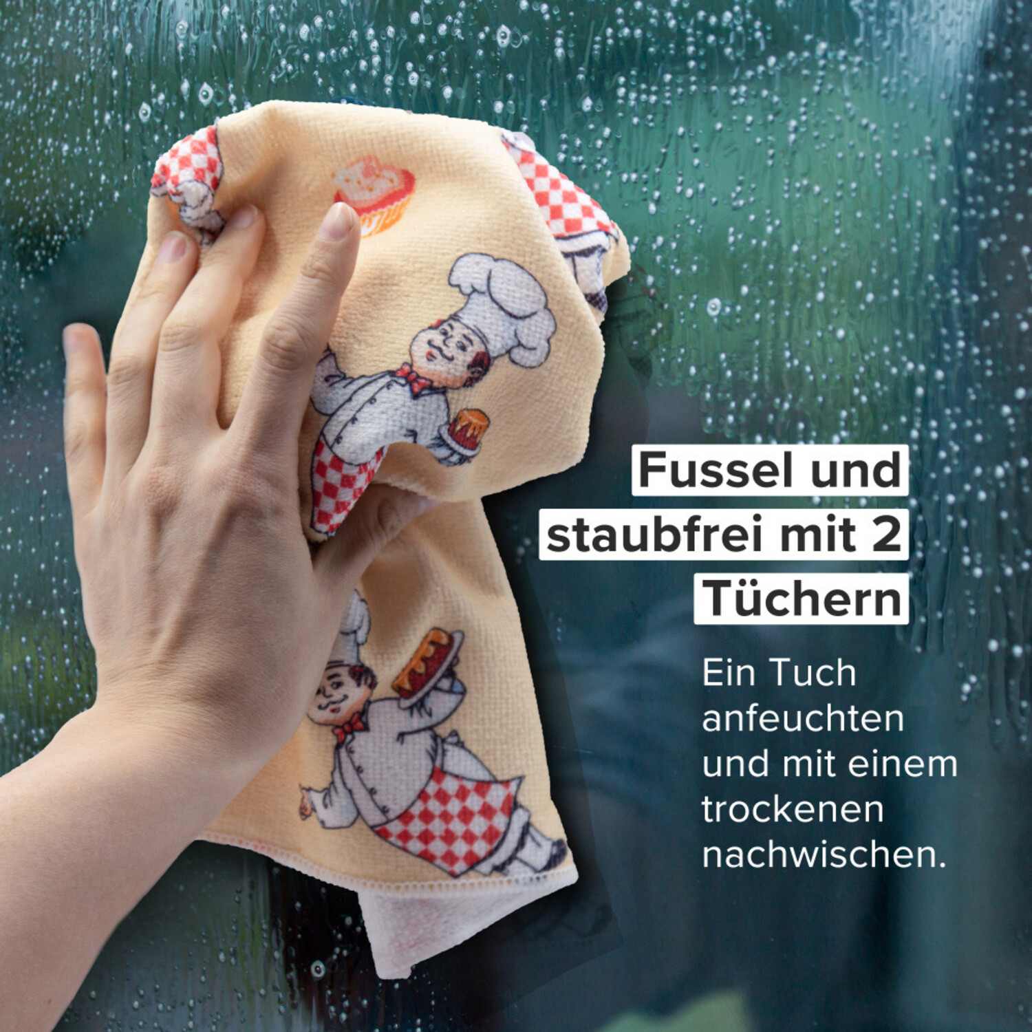 Tieto originálne utierky na riad z mikrovlákna Vás nadchnú. Kvalitné froté, ktoré nepúšťa vlákna a je extrémne savé. Veselý šéfkuchár prináša do kuchyne farby a dobrú náladu.