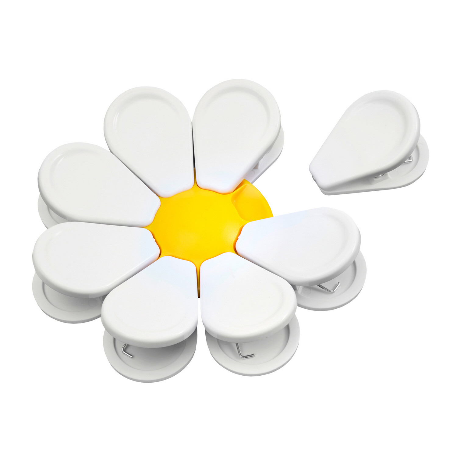 Udržujte čerstvosť korenia a chipsov v otvorených vreckách s týmito klipsami v tvare margarétky. 8 klipsov možno k sebe pripnúť a ušetriť tak miesto.