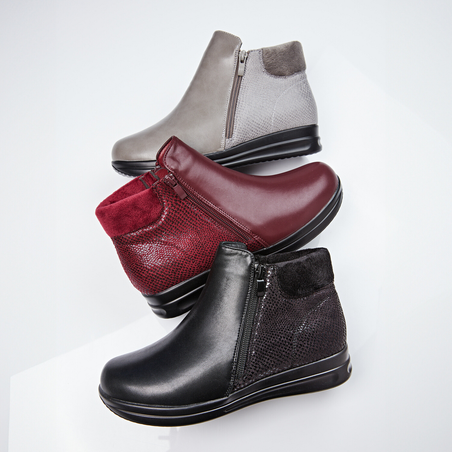 Hladká predná časť, elegantný krokodílí reliéf vzadu, zamatovo mäkký okraj a teplá podšívka – tieto členkové topánky si zamilujete. Zipsy na oboch stranách zaisťujú pohodlné obúvanie. Protišmyková klinová podošva má približne 3 cm vysoký podpätok.