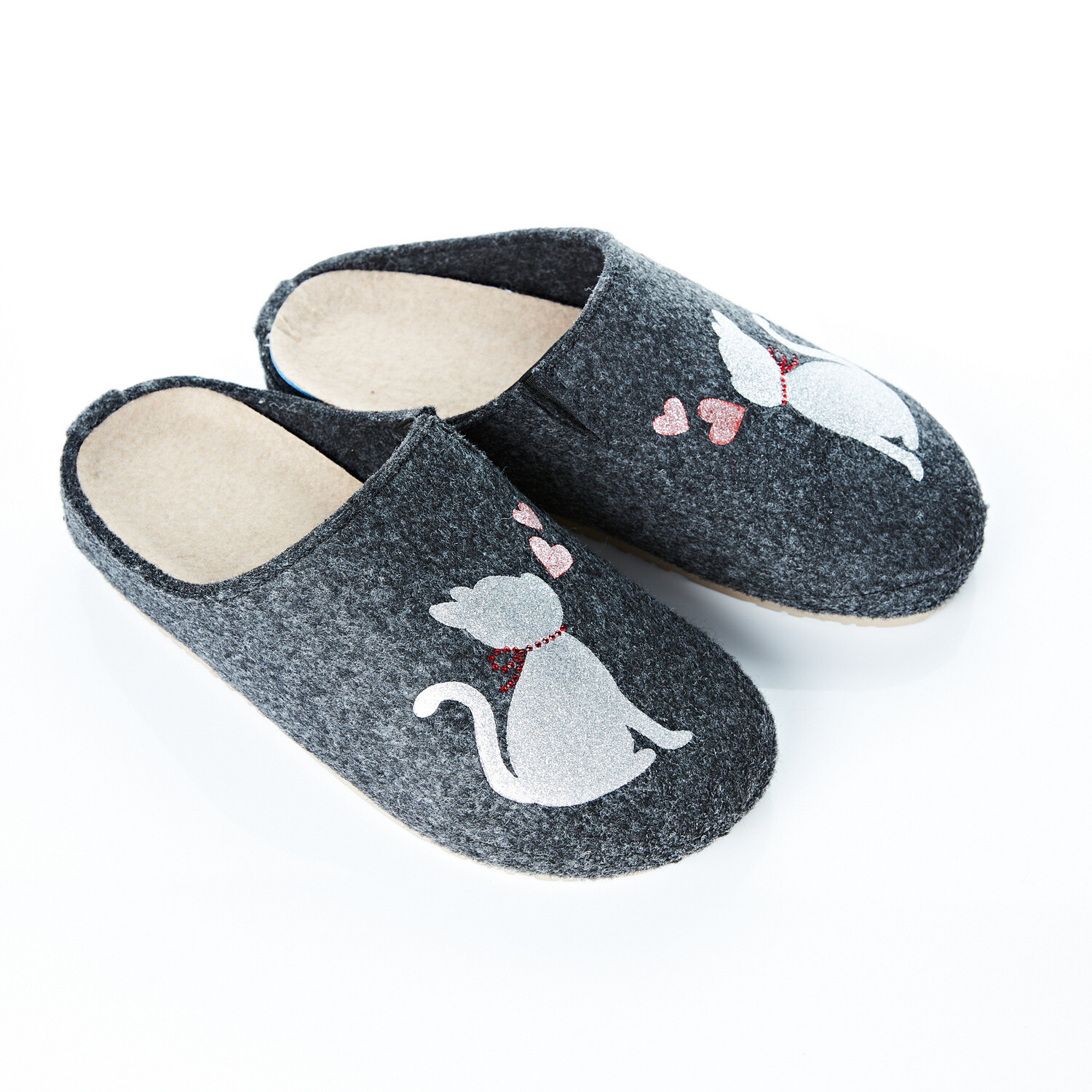 Najväčší trend: hrejivé plstené šľapky s trblietavým mačacím dekorom - elegantné a pohodlné. S elastickými vsadkami a vyberateľnou stielkou s mäkko vystuženou pätou.