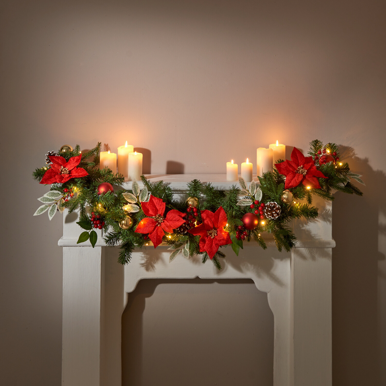 Svieža borovicová girlanda bohato zdobená poinsettiou, šiškami, mašľami a bobuľami. Neopadáva a bude Vás tešiť rok čo rok.Pripravená už ozdobená. Vyzerá ako živá. Veľa spôsobov dekorácie. Takmer 2 metre dlhá.