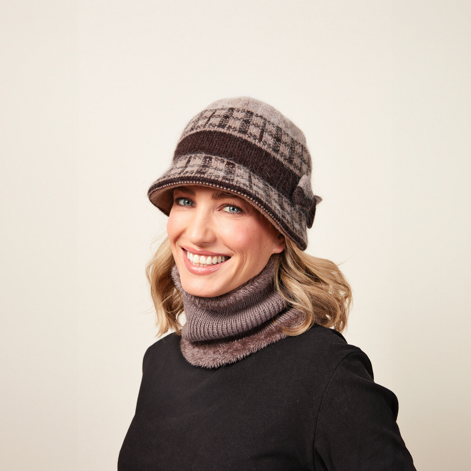 Elegantná pletenina s nadýchaným fleecom a nádhernou brošňou v tvare mašle! Táto módna čiapka s úzkym šiltom Vás ochráni pred chladom.