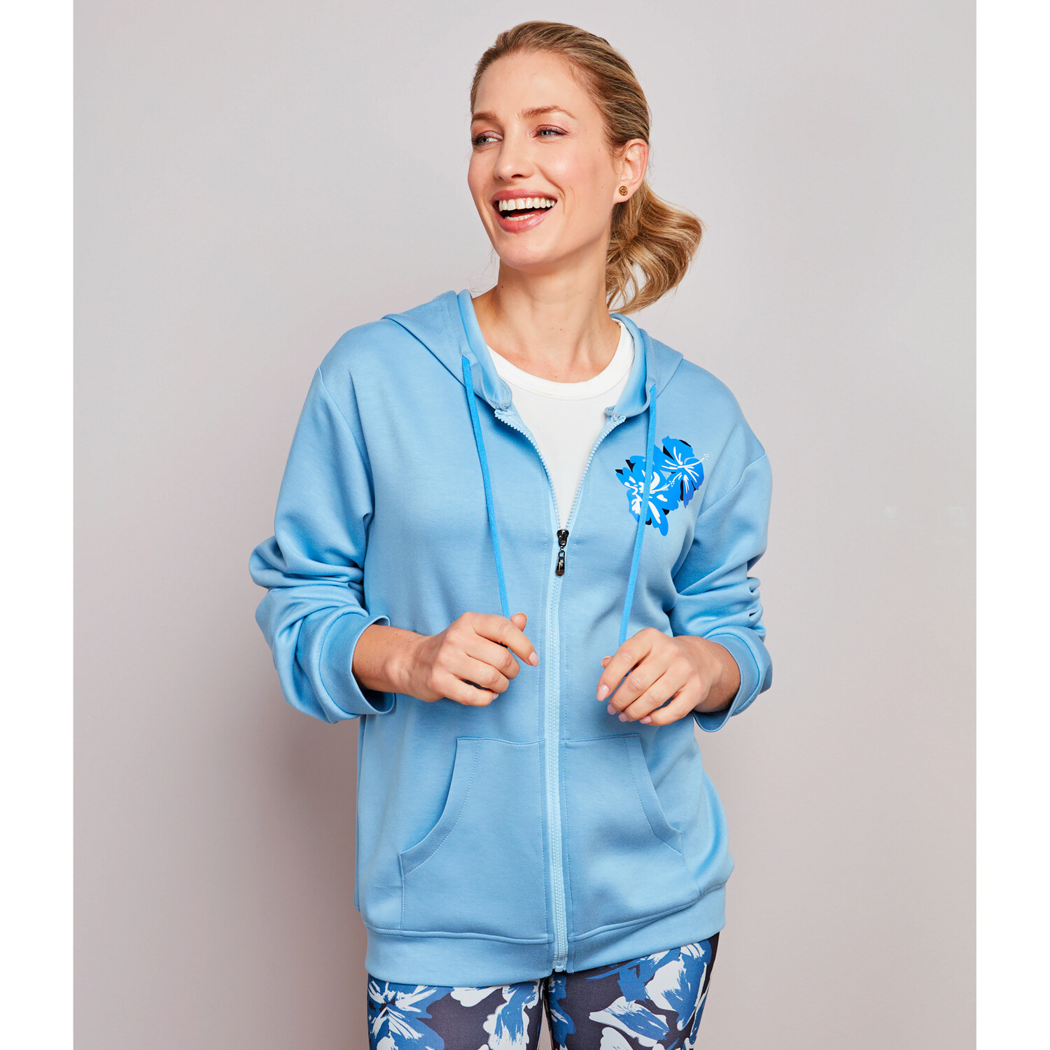 Či už ju nosíte na cvičenie alebo ako ležérny outfit, naša mikina s kvetinovou potlačou zvládne všetko. Predný zips, bočné vrecká. Iste sa stane Vaším obľúbeným kúskom.