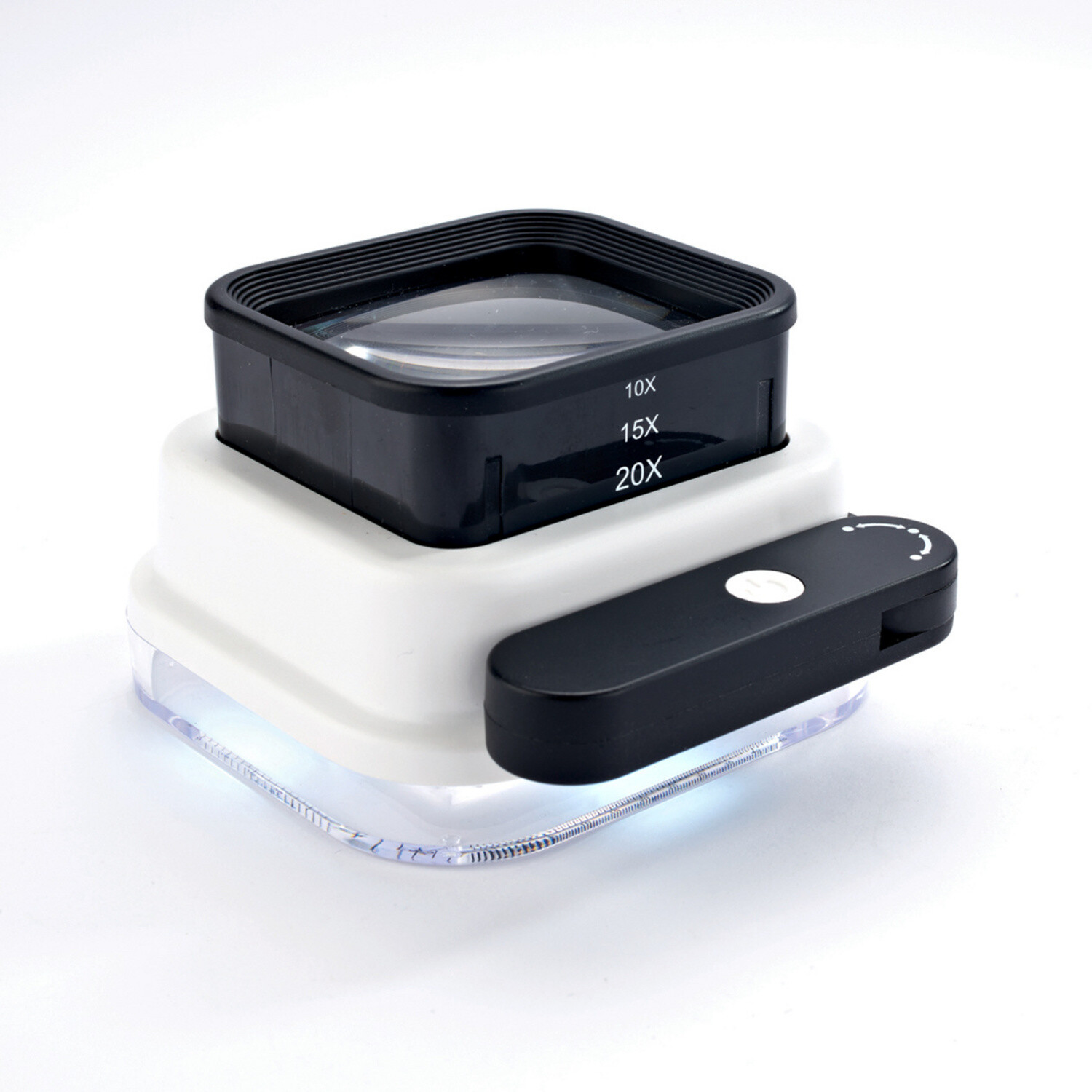 Túto mimoriadne praktickú lupu je možné používať troma rôznymi spôsobmi: ako závesnú, so stojanom alebo lupu do ruky. Môžete k nej pripevniť pružnú silikónovú rukoväť a vďaka tomu vám zostávajú obe ruky voľné. Rukoväť slúži aj ako stojan, alebo ju môžete úplne odňať. Rozmery: 18 x 12 cm.