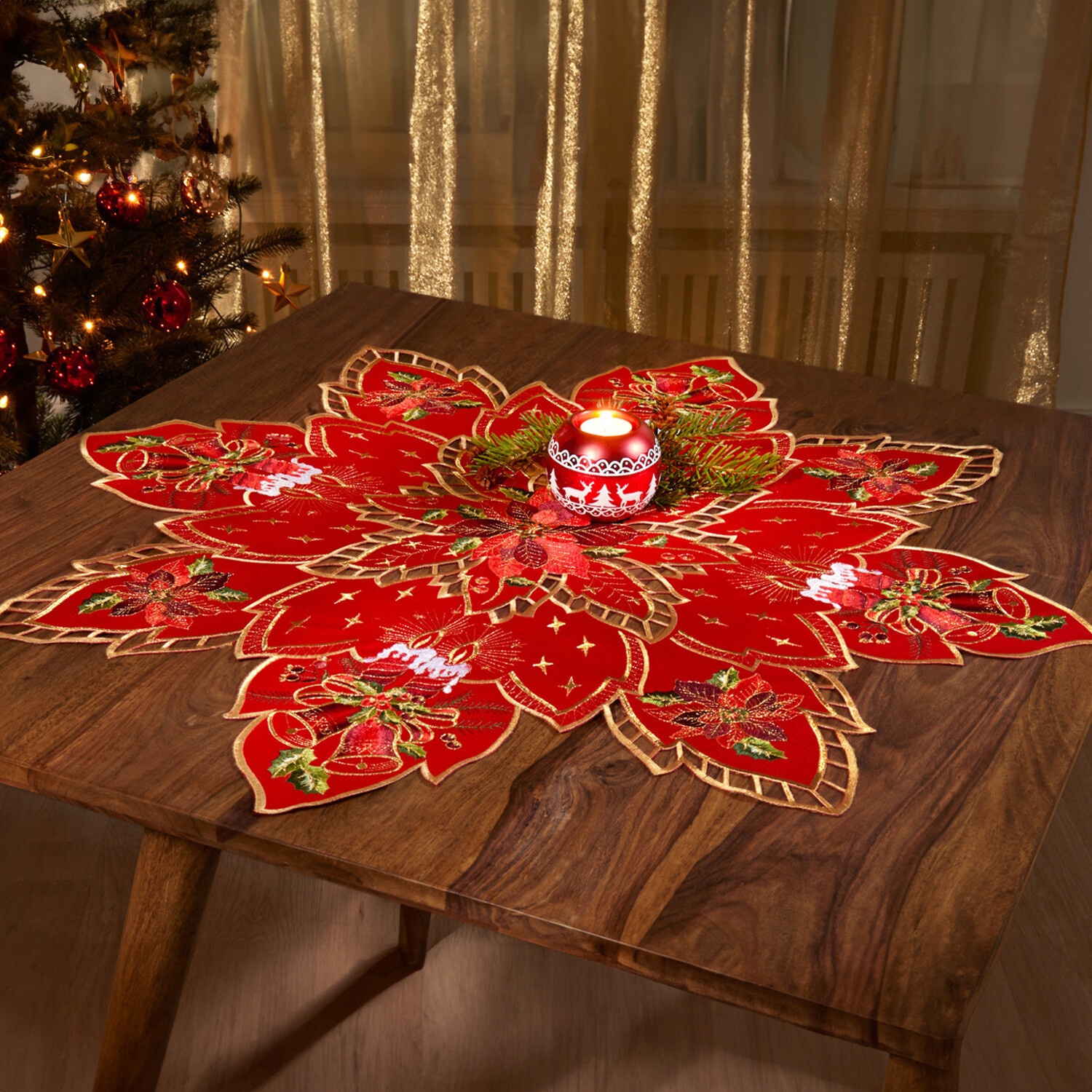 Ozdoba na Váš konferenčný stôl aj vianočnú tabuľu! Jemný obrus s vtkanými snehovými vločkami a jemným oblúčikovým okrajom dokonale doladí slávnostnú atmosféru. 100 % polyester. Možno prať na 30 °C. Motívy sčasti zlatisto sfarbené