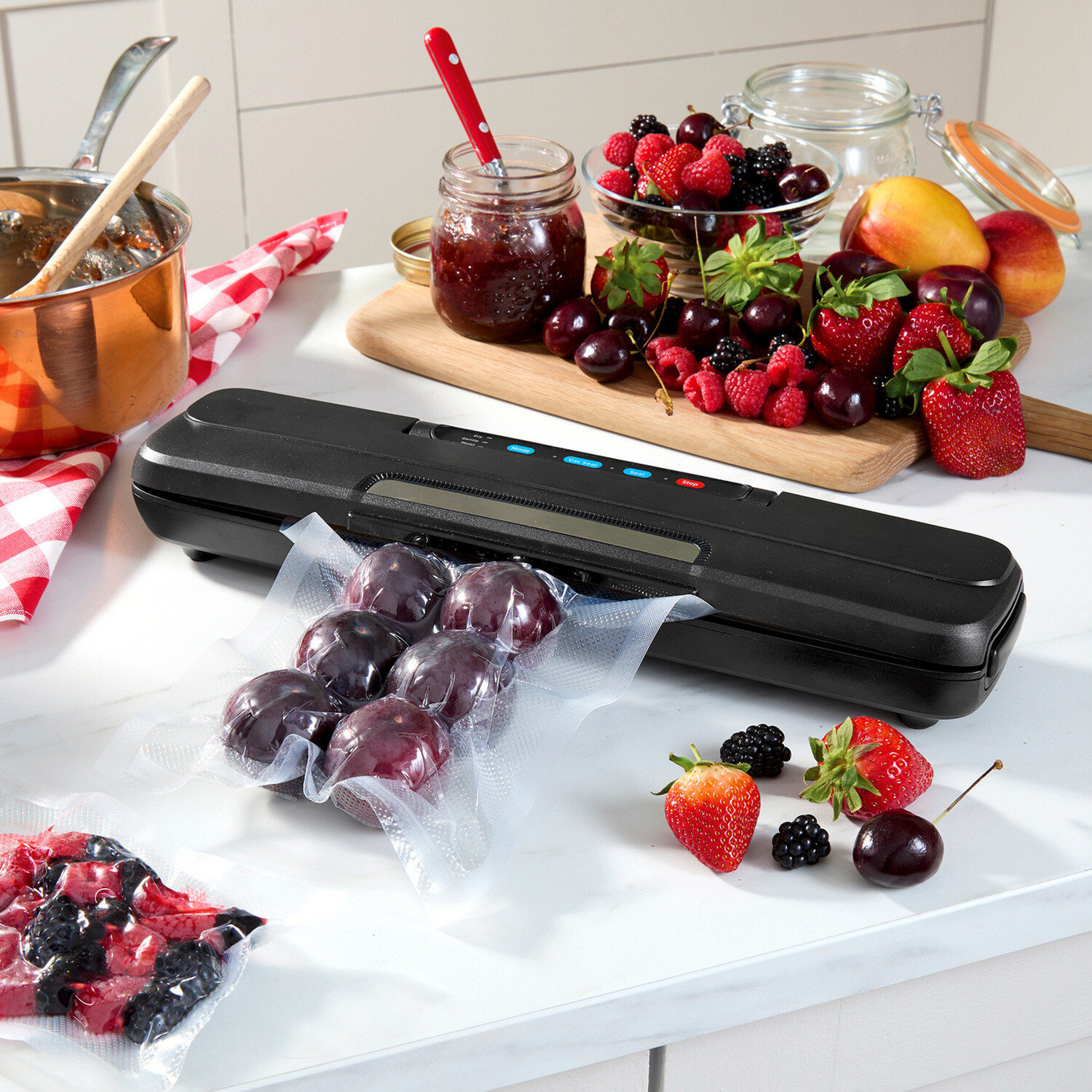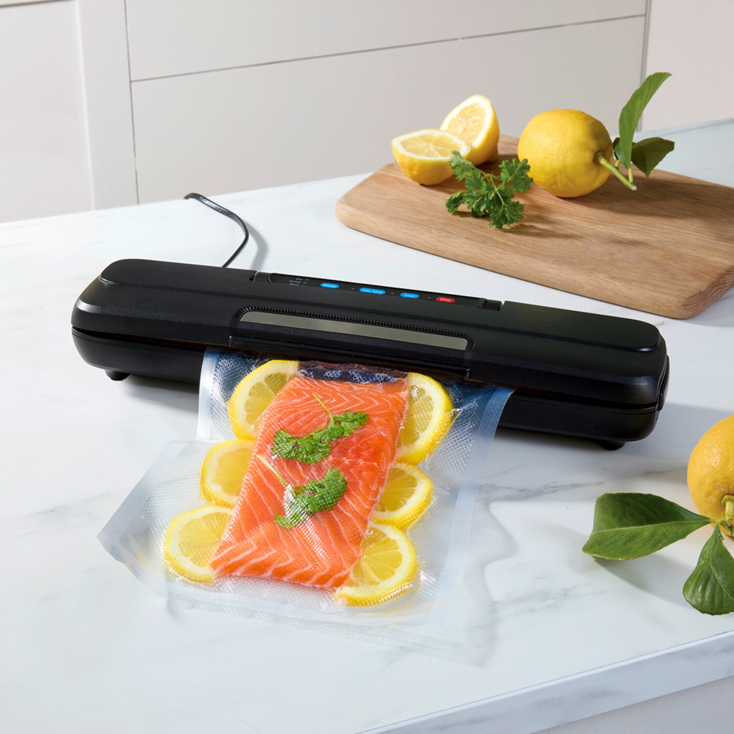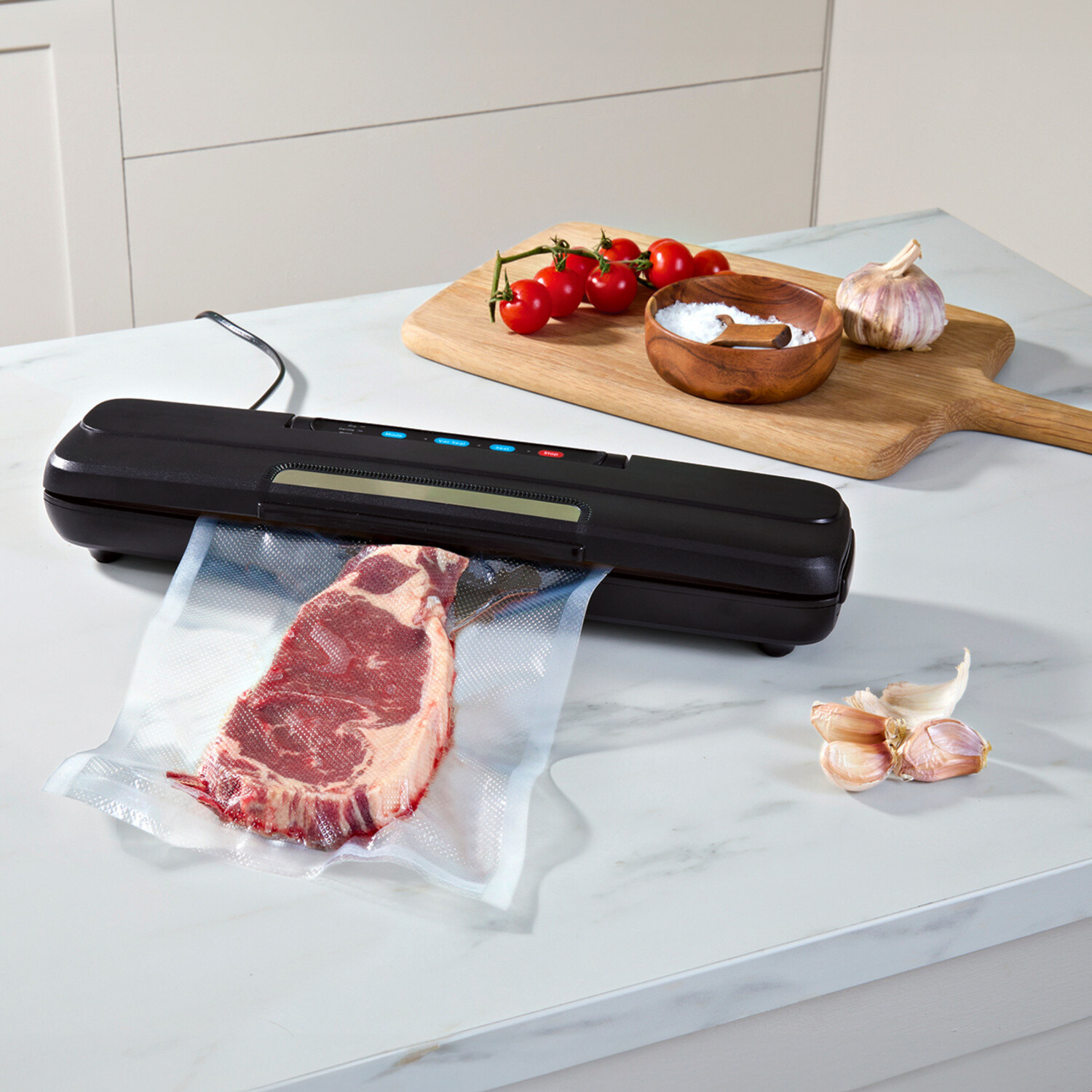 Predĺžte trvanlivosť potravín, znížte množstvo odpadu a ušetrite peniaze. Tento výkonný vákuovací prístroj utesní celé vrecko, takže šunka, zelenina, omáčky a mnoho ďalšieho zostane 5-krát dlhšie čerstvé. S rezačkou na vrecká. Uzavrie za 6-13 sekúnd, vákuovo uzavrie za 10-17 sekúnd.
