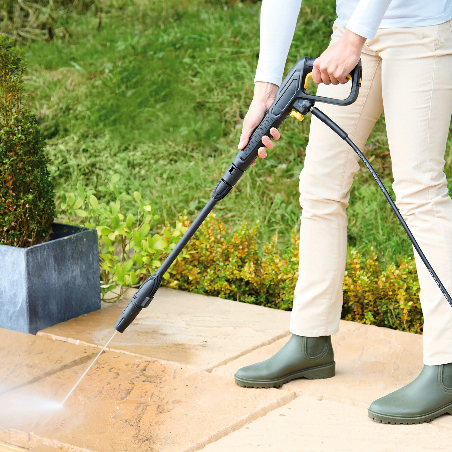 Vysokotlakový čistič s výkonom 1600 W, plynulo nastaviteľným tlakom (80–120 barov) a so širokou škálou príslušenstva: Tento tlakový čistič je ideálny na záhradný nábytok, terasy, autá a ďalšie povrchy. S pohodlným držadlom a kolieskami pre ľahkú manipuláciu. Napájací kábel: 5 m.