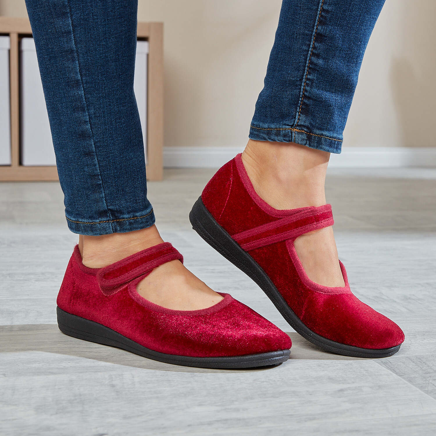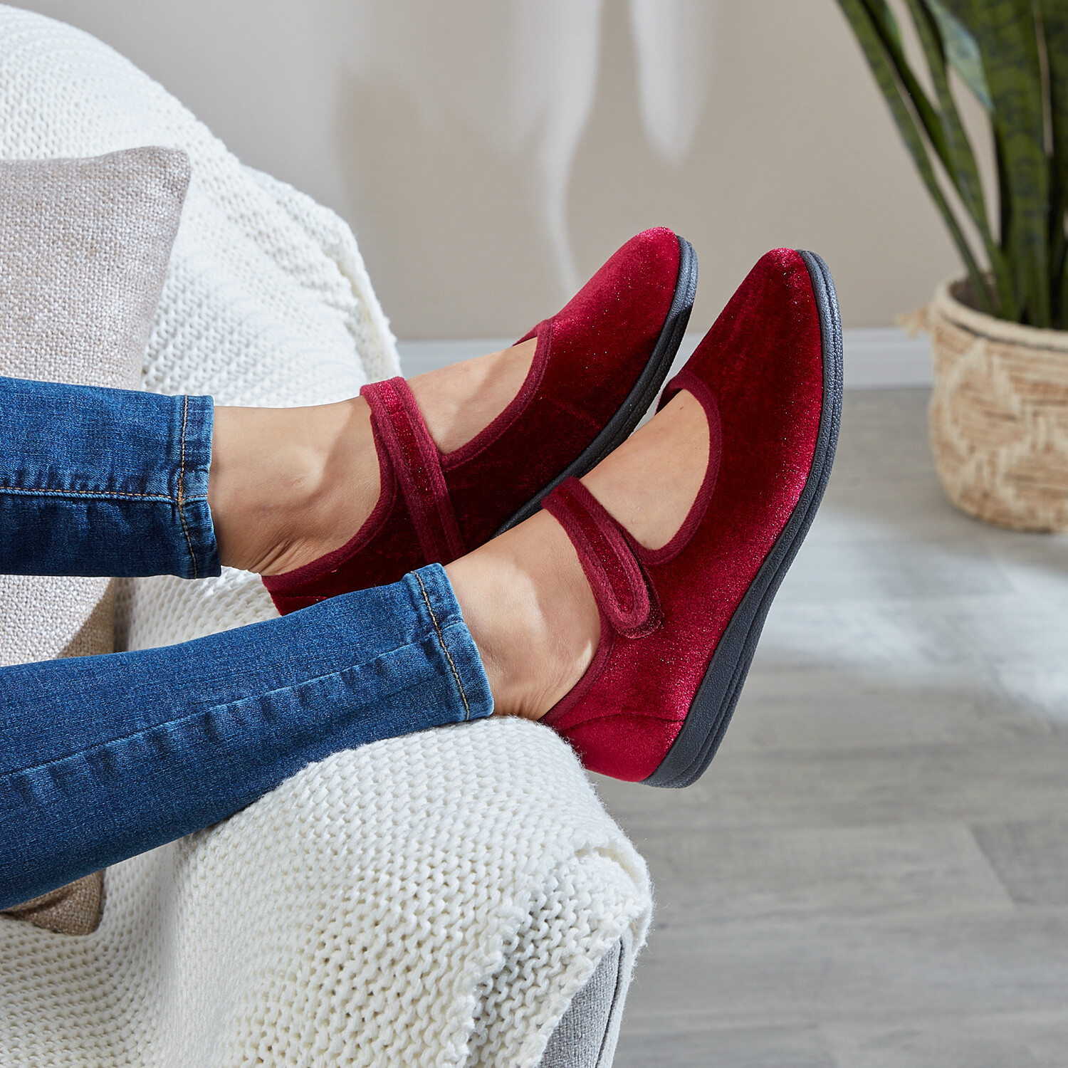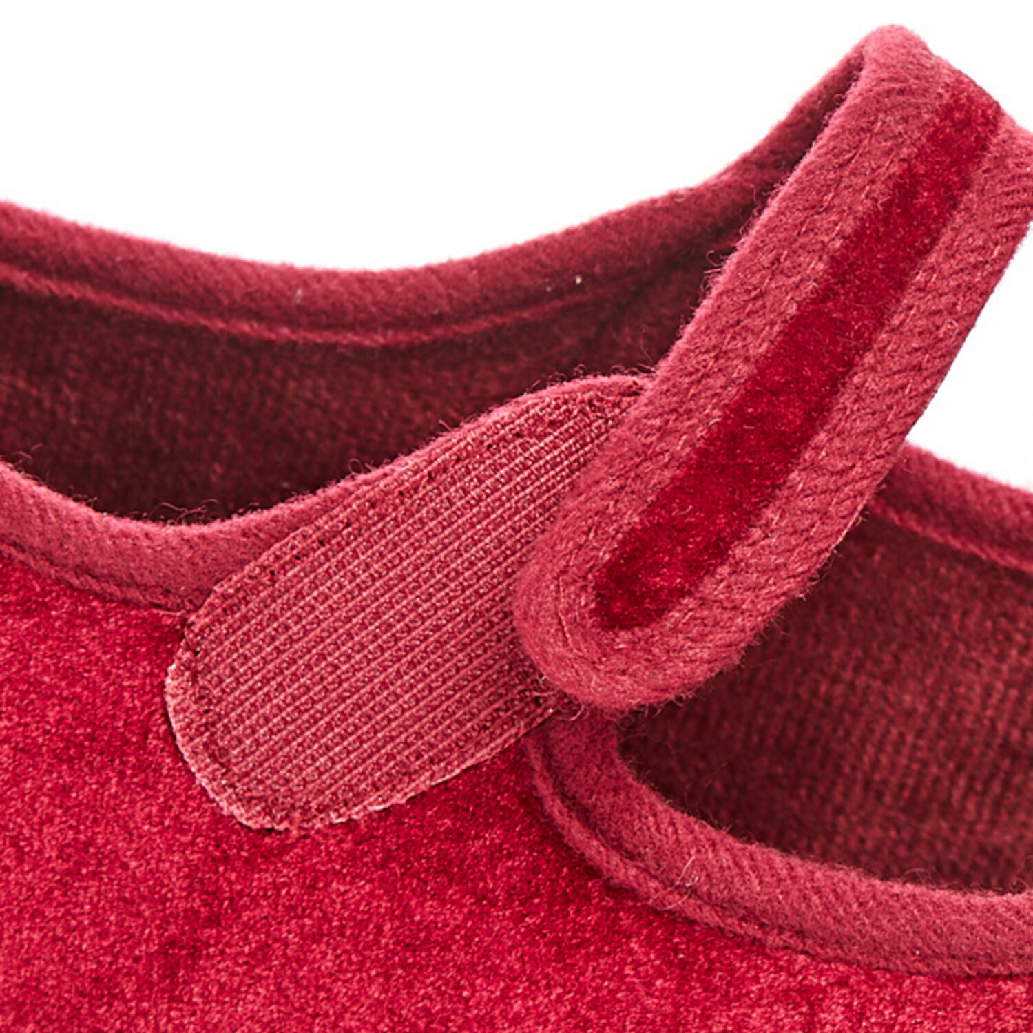 Zamat dodáva elegantný nádych tejto domácej obuvi v štýle balerínok. Pohodlný strih s pružným pásikom na suchý zips zaisťuje komfort, ľahkosť a štýl.