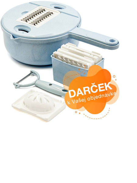 SET OBSAHUJE: vymeniteľné strúhadlá, misku s uchom, cedník s uchom, škrabku na zeleninu, vrchný diel na uchytenie strúhadiel. Farba: modrá. Materiál: plast, nerezová oceľ. Rozmery: 29 x 9,5 cm.
